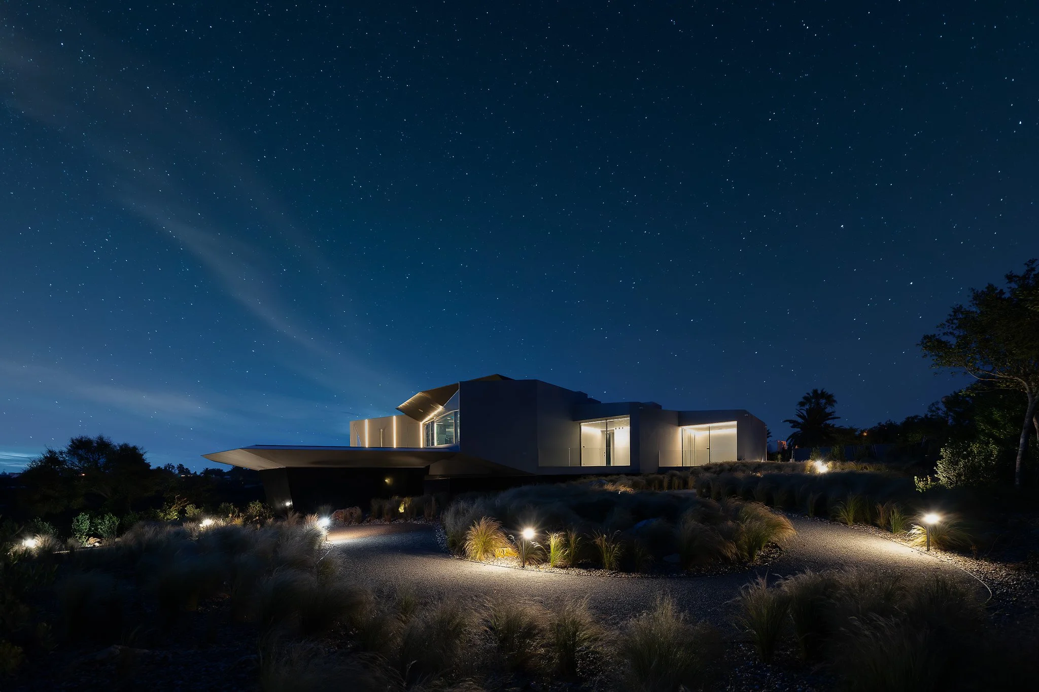 Every space was designed to make residents and visitors feel suddenly immersed in a futuristic environment. From the entrance door to the swimming pool outside, unusual angles and curves play with light and perspective making the building a playground for the imagination.